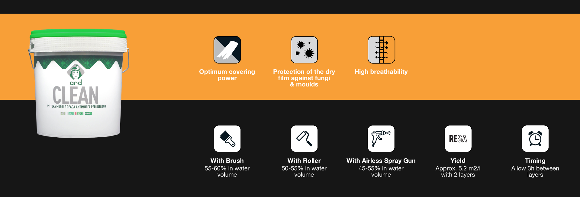 يوفر CLEAN جميع الصفات الأساسية للطلاء للديكورات الداخلية مثل قوة الإخفاء المثالية، والتصاق الركيزة، وقابلية الفرشاة الجيدة، والتدفق والتلميع.