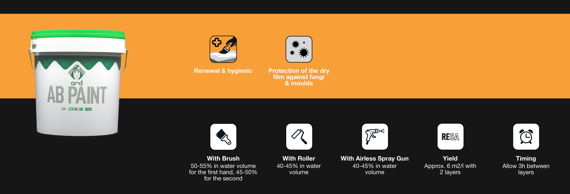 A-B PAINT is a paint based on synthetic copolymers in aqueous dispersion. It’s suitable for painting interior & exterior walls which require an effective protection against fungi, algae, moulds & bacteria.