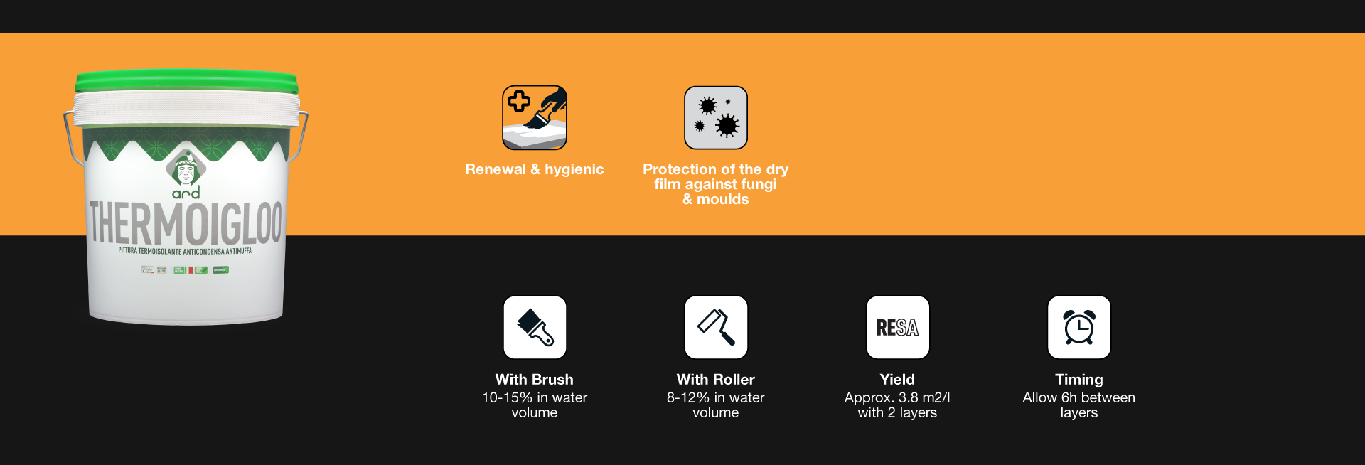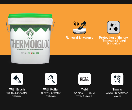 The presence of specific broad-spectrum biocides lend an effective protection against the spreading of fungi & mould on the dry film applied to the wall. THERMOigloo is suitable for the treatment of particularly humid premises such as kitchens, bathrooms, laundries, indoor swimming pools etc.