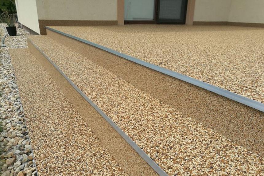 Synthetic resin-based, two-component, solvent-free formulation for spray application if required. The two highly reactive components are mixed together with the addition of different types of aggregates (marble, pebbles, quartz and others).